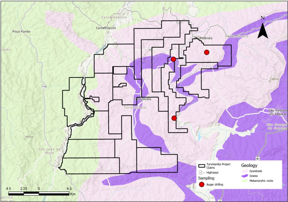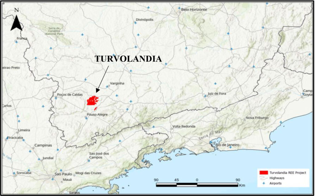 The Turvolandia Project is located immediately east of the Poços de Caldas alkaline complex, a 30‑square kilometre intrusive system in southern Minas Gerais that is rapidly emerging as one of Brazil’s most important ionic‑clay rare earth districts. This plateau hosts thick, deeply weathered clay profiles developed over REE‑enriched phonolitic and nepheline syenite, the same style of geology that underpins major ion‑adsorption clay deposits in southern China and has attracted significant global interest for its potential to support relatively lower‑cost extraction compared to traditional hard‑rock REE deposits. The property, situated in the southwest area of the state of Minas Gerais, Brazil, approximately 200 km northeast of São Paulo and 294 km southwest of Belo Horizonte, is prospective for ionic clay-hosted REE mineralization.