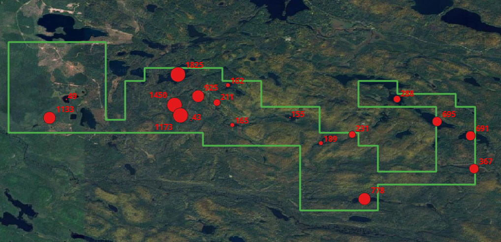 - Prospectivity: of the ~50,000 samples for Ontario, 26 exceeded 500 ppm (99.95% percentile) of which 3 (11.5%) were clustered in within the Garrow Township area